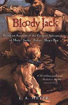 Bloody Jack, fully titled Bloody Jack: Being An Account of the Curious Adventures of Mary “Jacky” Faber, Ship’s Boy is a historical novel by L.A. Meyer. It is centered on an orphaned girl in London in the early 19th century. The story is continued in Curse of the Blue Tattoo, Under the Jolly Roger, In the Belly of the Bloodhound, Mississippi Jack, My Bonny Light Horseman, Rapture of the Deep, The Wake of the Lorelei Lee, The Mark of the Golden Dragon, Viva Jacquelina!, Boston Jacky, and Wild Rover No More.