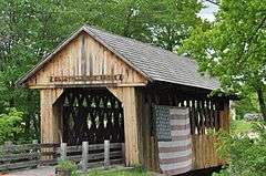 The Bog Bridge, also known as the Cilleyville Bridge, is a historic covered bridge in Andover, New Hampshire. The Town through truss bridge was built in 1887 by local carpenter Prentice C. Atwood. The bridge originally carried Bog Road across Pleasant Brook, but was reduced to foot traffic when the current alignment of New Hampshire Route 11 bypassed it. The bridge is 53 feet (16 m) long and 13 feet (4.0 m) wide, and is clad in vertical planking. The asphalt shingle roof, a replacement made in 1982, is the only major modification to the bridge. The bridge rests on abutments of roughly coursed granite blocks; the eastern abutment is original, without mortar, while the western abutment was damaged in the 1938 New England hurricane and rebuilt with cement mortar.[2]