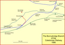 The Scottish Central Railway (SCR) opened its main line in 1848, connecting at junctions at Greenhill with the Edinburgh and Glasgow Railway (E&GR) and the Caledonian Railway. In the vicinity of Bonnybridge, the SCR route passed between the E&GR main line and the canal. A station was provided at Greenhill Junction,[note 1] but this was not convenient for Bonnybridge.[3]