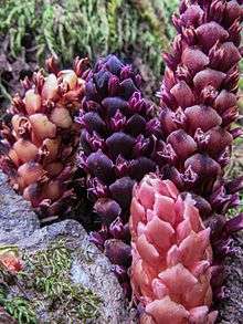It is native to western North America from British Columbia to northern California, where it grows in wooded areas. It is a parasite of salal bushes, which it parasitizes by penetrating them with haustoria to tap nutrients. The groundcone is visible aboveground as a purplish, brown, or yellowish cone-shaped inflorescence 3 to 6 centimeters long. Pale-colored flowers emerge from between the overlapping bracts. Coastal aboriginal groups ate the potato-like stembase of Ground Cones raw, though usually as a snack and not in any quantity .