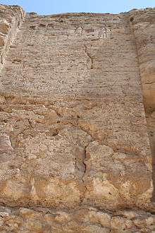 Stelae K, M, and X on the east side of the Nile contain what Davies termed the Earlier Proclamation.[5] All three stelae contain both vertical and horizontal lines of text. Stela K is the best preserved[8] and was made to replace Stela M which was damaged early on, thus necessitating a replacement.[9] Both Stela K and Stela M are located in the southern side of the site and the text in their horizontal lines reads from left to right, away from the center of the site. Stela X is located in the northern side of the site and it is a mirror image of stelae K and M in that its horizontal lines read from right to left, also away from the center.[8] The inscription on the stelae K, M, and X is dated to the fifth regnal year of Akhenaten in day 13 of the season of Peret. They include the full title of the god Aten, as well as titles of the king Akhenaten and the king’s wife Nefertiti. The stelae also describe the founding of the site by the pharaoh, reasons for choosing it, the proposed layout of the site, instructions regarding the burials of the royal family and certain notables, and instructions for the maintenance of the cult of Aten.[10] The Earlier Proclamation also includes a promise from Akhenaten to build various temples and other structures to the god Aten in the location.[11] The latter part of the text is fragmentary and has inspired a variety of interpretations.[12]