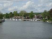 Bourne End's original location is somewhat different from today's established village centre, a half a mile downstream on the River Thames. The name refers to the end of the river (bourne being an Old English term for 'river'), and it would be the mouth of the River Wye that this is derived from. The then hamlet appears on Morden's 1722 map of Buckinghamshire as "Born end".[2] It was noted in the nineteenth century however, that the name had been corrupted to "Bone End", apparently through local mispronunciation, and thence on official maps and documents; in 1858, the vicar of Wooburn successfully reversed this, and the corrected name remains in use today.[3]