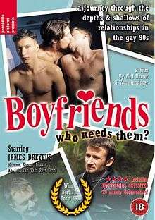 Boyfriends is a 1996 British independent film. Three gay couples, all of whom are suffering relationship problems, spend a weekend at the seaside and learn how to deal with their issues from each other. The film was written and directed by Tom Hunsinger and Neil Hunter. The film was James Dreyfus' last role as an unknown before taking the part of Constable Goody in The Thin Blue Line. The film also starred Mark Sands, Michael Urwin, Andrew Ableson, David Coffey, Darren Petrucci and Michael McGrath.