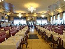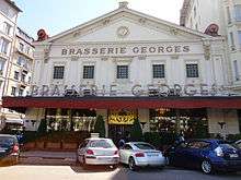 The Brasserie Georges is a restaurant located in the 2nd arrondissement of Lyon. It is the oldest brasserie in the city and one of the largest brasseries in Europe.[1] Its reputation is now international. With a history closely linked to that of Lyon, the brasserie serves typical dishes including the famous sausage of Lyon with pistachios, and recipes from other regions such as sauerkraut, baked Alaska or the seafood. In 1986 was served the biggest sauerkraut in the world; its weighed a ton and a half. In 1996, the largest baked Alaska (34 metres) has been served. The Brassarie Georges brews its own beer, a tradition from its inception, when water in Lyon was considered of exceptional quality. The restaurant never closes during the year. Over seven-hundred guests can be served at each service.[2] On 8 December, during the fête des lumières, over 2,500 meals were served in a service. It is sometimes called the BG or Le Georges.
