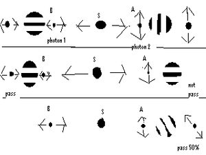 This state is called "factored" because it is, technically, the product of the two photons. Its properties are rather obvious and are illustrated in Figure G. For example if, given the state , we carry out a test of vertical polarization on the photon on the right and a test of horizontal polarization on the photon to the left, we know that both of them will pass with certainty. Similarly, if we carry out (center of figure) a test of horizontal polarization on both of the photons, the one on the right will certainly fail, while the one on the left will certainly pass. Lastly, consider the more general case in which the photon to the right is passed through a filter polarized at 45°. In this case, the photon 2 will pass through 1/2 of the time and end up polarized at 45°, and it will fail to pass the other 1/2. The photon on the left has not been tested and therefore remains horizontally polarized.