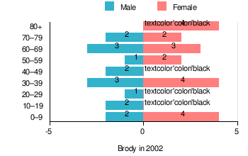 According to the 2002 Poland census, there were 35 people residing in Brody village, of whom 45.7% were male and 54.3% were female. In the village, the population was spread out with 22.9% under the age of 18, 25.7% from 18 to 44, 17.1% from 45 to 64, and 34.3% who were 65 years of age or older.[1]