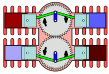 Designed as a team effort by Brough, 'Ike' Hatch, and Freddie Dixon, the engine has two horizontally opposed flat twins one above the other and geared together, thus rotating counter to each other forming an H engine. Connecting rods from opposed cylinders were of the fork and blade type and thus shared a common crank pin. All pistons moved in unison, that is to the left or to the right at the same time. The pistons could thus be counterweighted 100% yielding a perfect balance. Primary, secondary and higher-order sources of vibration canceled each other, as did the gyroscopic effects from each crankshaft.[2][3][4][5]
