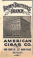 Brown Brothers Tobacco Company , was located at 119 State Street in Detroit. The building was built for brothers, Robert Hamilton Brown and John Brown who founded a cigar manufacturing business which was, at one time, the largest cigar factory under one roof in the world. Brown Brothers were known for the following cigar brands: Newsboys, Cremo, Fontella, Carmencita, Evangeline and Detroit Free Press.[1] [2] [3] [4] [5]