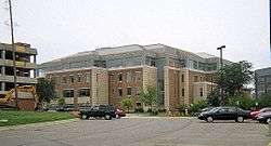 The Bruce T. Halle Library often simply referred to as Halle Library, is the sole library on the Eastern Michigan University campus.[3] It includes computer labs, study spaces, the Holman Learning Center (which provides free tutoring), a distance-learning classroom, the Faculty Development Center, the IT Help Desk, a multi-media area, a theater, an auditorium, the University archives, the carillon tower, and a Cafe.[3] It houses one of the largest collections of children's literature in the United States.[4][5] The building has full wireless connectivity, as well as Automated Retrieval Collection (ARC) system, capable of housing 1 million items. While the most-used books are still on shelves, the majority of the school's books are stored within this system, which runs several stories underneath the library itself. Bruce Halle is the founder of Discount Tire Company, and has been a major benefactor.