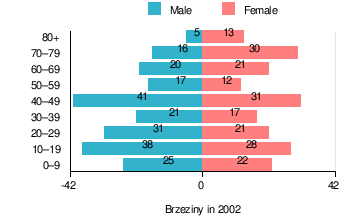 (by age group in 2002)TOTAL 0–9 10–19 20–29 30–39 40–49 50–59 60–69 70–79 80 + I. TOTAL person 409 47 66 52 38 72 29 41 46 18 — of which in % 100 11.5 16.1 12.7 9.3 17.6 7.1 10 11.2 4.4 1. BY SEX A. Males person 214 25 38 31 21 41 17 20 16 5 — of which in % 52.3 6.1 9.3 7.6 5.1 10 4.2 4.9 3.9 1.2 B. Females person 195 22 28 21 17 31 12 21 30 13 — of which in % 47.7 5.4 6.8 5.1 4.2 7.6 2.9 5.1 7.3 3.2