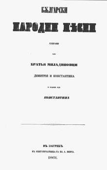 Bulgarian Folk Songs[1][note 1] (Cyrillic: Бѫлгарски народни пѣсни,[note 2] modern Bulgarian: Български народни песни, Macedonian: Бугарски народни песни) is a collection of folk songs and traditions from the regions of Macedonia and Bulgaria published in 1861 by the Miladinov brothers. The book represents an anthology of 660 folk songs, but also folk legends, traditions, rituals, names, riddles, and proverbs.[2] It was published in Zagreb in 1861, under the patronage of the Croatian bishop Joseph Strossmayer. The second edition came out in 1891, in the Principality of Bulgaria.