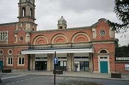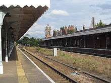 The most noteworthy feature of the station, which is constructed of red brick with stone dressings, is a pair of towers (originally linked by an overall roof, removed in 1893) on either side of the tracks at the eastern end of the layout. As first built – as a terminus – the station had four tracks, although in practice only one platform was used before the line was extended to Newmarket in 1854. Today a wide space separates the two surviving through tracks, which serve Platform 2 (for trains from Ipswich) and Platform 1 (called at by those heading east).[13][14]