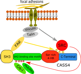 . PMID 24400094. - ↑ Tornillo G, Defilippi P, Cabodi S (2014). "Cas proteins: dodgy scaffolding in breast cancer". Breast Cancer Research. 16 (5): 443. doi:10.1186/s13058-014-0443-5. PMID 25606587.