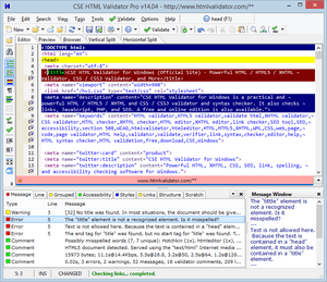 CSE HTML Validator is a native desktop software application for Microsoft Windows. The software assists web developers in creating syntactically correct and accessible HTML, XHTML, and CSS documents (including HTML5 and CSS3) by locating errors, potential problems, and common mistakes. It is also able to check links, suggest improvements, alert developers to deprecated, obsolete, or proprietary tags, attributes, and CSS properties, and find issues that can affect search engine optimization.