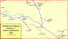 The line ran from Rutherglen Junction on the Clydesdale Junction main line, crossing the River Clyde and on through Carmyle to Langloan Junction, where it divided; a northward arm ran to Coatbridge station, and a southward fork led to Whifflat Junction. (Whifflat is spelt Whifflet nowadays.) Both junctions were on the Caledonian main line south of Coatbridge; there were a great number of pits and ironworks in the general area there; Dundyvan, Langloan and Summerlee ironworks were directly served. In addition several pits developed along the line of route from Carmyle eastwards.[3][5]