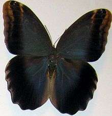 The Brazilian Owl, Sulanus Owl, and Almond-eyed Owl [1] (Caligo brasiliensis) is a butterfly of the Nymphalidae family. The species can be found in most of South America as various subspecies, including Brazil, Colombia, Venezuela, and Ecuador. Its range extends through Trinidad, Honduras, Guatemala, and Panama north to Mexico.