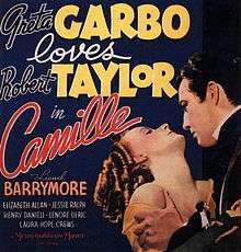 Camille (1936) is an American romantic drama film from Metro-Goldwyn-Mayer directed by George Cukor and produced by Irving Thalberg and Bernard H. Hyman, from a screenplay by James Hilton, Zoë Akins and Frances Marion.[3] The picture is based on the 1848 novel and 1852 play La Dame aux Camélias by Alexandre Dumas, fils. The film stars Greta Garbo, Robert Taylor, Lionel Barrymore, Elizabeth Allan, Jessie Ralph, Henry Daniell, and Laura Hope Crews. It grossed $2,842,000.[1]