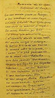 The Cantar de los Siete Infantes de Lara (Song of the Seven Lara Princes) is a lost cantar de gesta that related a tale of revenge over the murder of the seven infantes, princes, of Lara or Salas. The legend it conveyed survives in prose form in medieval chronicles, the oldest being in the extended version of the Estoria de España (History of Spain) compiles during the reign of Sancho IV of Castile, before 1289 (edited by Ramón Menéndez Pidal under the name Primera Crónica General).[1] From the account found in this chronicle as well as mention in the Crónica de 1344 (Segunda Crónica General) and interpolations into a copy of the Tercera Crónica General dating from 1512, Menéndez Pidal found evidence for the existence of an ancient cantar de gesta, lost but partially reconstructed, dating back to the year 1000, that would, along with the Cantar de Mio Cid and the Poema de Fernán González, represent one of the most important epic cantares of Castilian literature, and the most primitive example of the Spanish epic. The legendary tradition of the Infantes de Lara has also been developed though ballads. The Infantes de Lara were the children of Castilian nobleman Gonzalo Gustioz of Lara or Salas and his wife Sancha Velásquez, known in the story as "Doña Sancha" (lady Sancha). The story revolves around a family feud between their family and that of her brother, Ruy Velázquez and his wife Doña Lambra, with revenge being the main driver of the action.