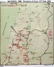 By early afternoon of 21 September, organised Yildirim Army Group resistance in the Judean Hills had ceased, most of the Ottoman Eighth Army had surrendered while the Seventh Army was retreating east down the Wadi el Fara road hoping to cross the Jordan River by the bridge at Jisr ed Damieh.[12][13]
