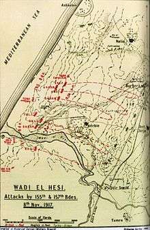 A second group of the retreating Gaza garrison had marched through the previous night, to gain distance and time to establish light field defences on a strong position just north of the Wadi el Hesi, seven miles (11 km) north north east of Gaza. In the sand dunes and in the cultivated area nearby, they constructed a series of short trenches. Behind these defences they resisted the EEF advance all day,[20][21][22][23] making a determined stand on the Wadi el Hesi.[24] It was towards this line held by the 7th Division, that the 53rd Division had withdrawn,[25] while the 3rd Division held Beit Hanun.[26]