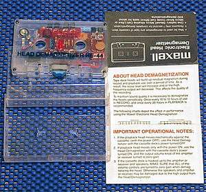 A third design consisted of a cassette shell with a head cleaning tape wound on the spools and a disc shaped magnet mounted above the head cleaner tape such that when the play button was activated the head cleaner physically cleaned the head surface and simultaneously made the magnet rotate, creating the alternating magnetic field required for demagnetizing.