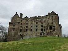 Much of this castle rebuilding was planned and financed by James Hamilton of Finnart (c. 1495–1540), in addition to his work at Blackness Castle, Rothesay Castle, the house at Crawfordjohn, the "New Inn" in the St Andrews Cathedral Priory and the lodging at Balmerino Abbey for the ailing Queen Madeleine.[37] Rather than slavishly copying continental forms, most Scottish architecture incorporated elements of these styles into traditional local patterns,[35] adapting them to Scottish idioms and materials (particularly stone and harl).[38] Similar themes can be seen in the private houses of aristocrats, as in Mar's Wark, Stirling (c. 1570) and Crichton Castle, built for the Earl of Bothwell in 1580s.[39]