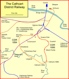 The Cathcart District Railway was proposed to serve the arising demand for suburban residential travel on the south side of Glasgow, Scotland. It was planned as a loop running to and from Glasgow Central station, but at first only the eastern arm, to Cathcart via Queens Park, was built, opening in 1886. The western arm was opened in 1894 and trains operated round the loop. A frequent passenger train service was operated, and there was also a limited goods and mineral operation.