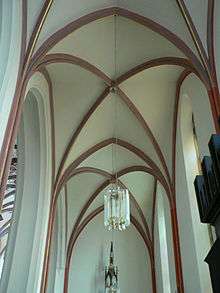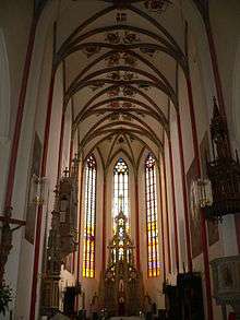 The presbytery is a place for spiritual ceremonies. This space is elevated by one step from the rest of the church. The bundles of the ribs in presbytery are mostly tight to the ground. Besides painted keystones is the ceiling decorated with painted coats of arms of the diocesan bishops, archbishops and the Pope John Paul II.