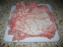 Caul fat, also known as lace fat, mesentery, crépine or fat netting, is the thin membrane which surrounds the stomach internal organs of some animals, such as cows, sheep, and pigs, also known as the greater omentum. It is used as a casing for sausages, roulades, pâtés, and various other meat dishes.[1] Examples of such dishes are Swiss atriau,[2] French crépinette,[3] Cypriot sheftalia, English faggots,[1] and Italian fegatelli. In the traditional Ukrainian and Russian cuisine, caul fat, known as salnik or salnyk, was usually filled with kasha and liver, and baked in a clay pot in the Russian oven.[4]