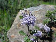 Ceanothus confusus is a species of shrub in the buckthorn family Rhamnaceae known by the common name Rincon Ridge ceanothus. It is endemic to northern California where it grows in the coastal mountains north of the San Francisco Bay Area. Its habitats include coniferous forest, woodland, and chaparral.[1] This is a low, spreading shrub often forming a short mat up to about 1.2 meters wide. The stem is gray-brown with new twigs having a reddish color and fuzzy texture. The evergreen leaves are oppositely arranged. Each is up to 2 centimeters long and oval in shape with 3 to 5 large teeth. The upper surface is shiny green and the underside is paler and feltlike in texture with hairs along the veins. The inflorescence is a small cluster of blue or purple flowers. The fruit is a horned capsule about half a centimeter wide.
