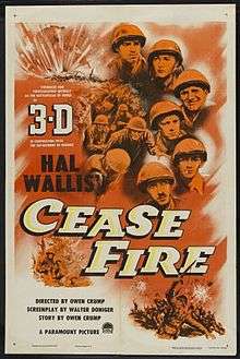 Cease Fire! is a movie made in 1953 by Owen Crump. The film featured real ammunition and real soldiers that were filmed on location in Korea, and additionally was one of the first 3D war movies.