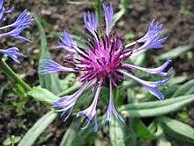 Centaurea (/ˌsɛntɔːˈriːə/)[1] is a genus of between 350 and 600 species of herbaceous thistle-like flowering plants in the family Asteraceae. Members of the genus are found only north of the equator, mostly in the Eastern Hemisphere; the Middle East and surrounding regions are particularly species-rich. Common names for this genus are centaury, centory, starthistles, knapweeds, centaureas and the more ambiguous "bluets"; a vernacular name used for these plants in parts of England is "loggerheads" (common knapweed). The Plectocephalus group – possibly a distinct genus – is known as basketflowers. "Cornflowers" is used for a few species, but that term more often specifically means C. cyanus (sometimes also called "basket flower"). The common name "centaury" is sometimes used, although this also refers to the unrelated plant genus Centaurium.[2]
