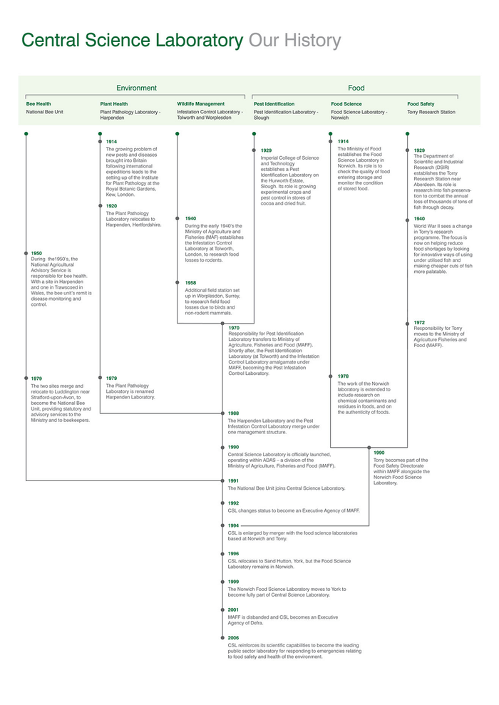 On April 1, 2009, Central Science Laboratory merged with Defra's Plant Health and Seeds Inspectorate, Plant Varieties and Seeds, Defra Plant Health Division and the Government Decontamination Service to form The Food and Environment Research Agency, an Executive Agency of Defra.