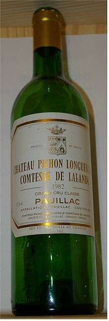 Château Pichon Longueville Comtesse de Lalande (commonly referred to as Pichon Lalande or Pichon Comtesse) is a winery in the Pauillac appellation of the Bordeaux region of France. Château Pichon Longueville Comtesse de Lalande is also the name of the red wine produced by this property. The wine produced here was classified as one of fifteen Deuxièmes Crus (Second Growths) in the original Bordeaux Wine Official Classification of 1855.