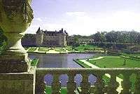 The château has a Garden à la française, redone in 1936-1939, featuring a terrace with an Italian gallery, a monumental stairway, a parterre with four compartments and a fountain, topiary, and statues. The property is entered via the 'Porte des Lions', an imposing 17th century edifice. Inside the moat is the 'keep', an ancient machicolated tower.