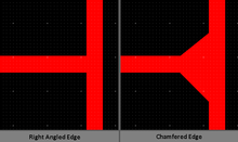 In printed circuit board (PCB) designing, a chamfer occurs when a right-angled edge is eliminated from the tracks, to strengthen the places where a track meets another at a right angle. It also reduces reflections, which is important for high-frequency design.[3]