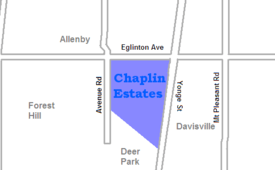 Chaplin Estates is a neighbourhood that covers the southwest portion of the Yonge and Eglinton area in Toronto, Ontario, Canada. It lies west of Yonge Street and is bounded by Eglinton Avenue to the north and Avenue Road to the west. The southern boundary is Chaplin Crescent which itself runs parallel to the former Beltline Railway line, now the Beltline Trail, a scenic walking and biking trail. A portion of the Toronto Transit Commission's Yonge-University-Spadina subway line runs aboveground in the eastern fringe of Chaplin Estates, and transit access is provided through Davisville station and Eglinton station.