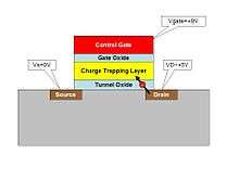 Electrons are moved onto the charge trapping layer similarly to the way that floating gate NOR flash is programmed, through channel hot electron (CHE) injection mechanism also known as Hot-carrier injection. In brief, a high voltage is placed between the control gate while a medium-high voltage is applied on the source and the drain while a current is induced from the source to the drain. Those electrons that have gained sufficient energy in traversing through the high-field region near the drain will boil off from the channel to be injected into the charge trapping layer where they come to rest.