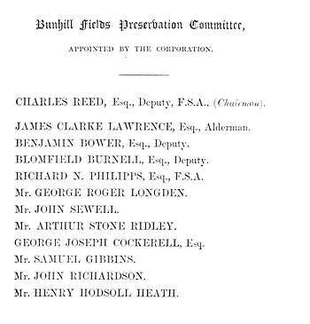 In a move to prevent the land from being built upon on expiry of a longstanding lease, the Corporation of the City of London formed a special Bunhill Fields Burial Ground Committee in 1865, which became formally known as the Bunhill Fields Preservation Committee. The committee, appointed by the Corporation, consisted of twelve advisors under Reed's chairmanship. Following the work of the committee, the City of London Corporation obtained an Act of Parliament in 1867 for the Preservation of Bunhill Fields Burial Ground as a public open space with seating, gardens, and for the restoration of some of its worthiest monuments, including one to Daniel Defoe funded by The Christian World and unveiled by Reed. The new park was opened by the Lord Mayor on 14 October 1869.[13]