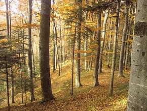 Vegetation of forests consists of trees and shrubs: English Oak (Quercus robur), Common hornbeam (Carpinus betulus), European beech (Fagus sylvatica), European ash (Fraxinus excelsior), Turkey oak (Quercus cerris), Sessile Oak (Quercus petraea), Black Alder (Alnus glutinosa), European yew (Taxus baccata), Manna Ash (Fraxinus ornus), Turkish Hazel (Corylus colurna), European Cornel (Cornus mas), Eurasian smoketree (Cotynus coggygria), Ruscus (species of: Ruscus aculeatus or Ruscus hypogllosum) or Lilac (Syringa vulgaris).[7]