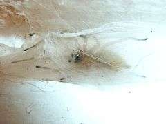 | Long-legged sac spider Cheiracanthium furculatum in its silk sac retreat, Pretoria, South Africa. It would emerge after dark to hunt. Entering of houses associated with onset of summer. | |