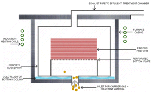 A typical demonstration of the process is shown in Figure 1. Here, the gases and matrix material enter the reactor from the feed system at the bottom of the reactor. The fibrous preform undergoes a chemical reaction at high temperature with the matrix material and thus the latter infiltrates in the fiber or preform crevices.