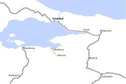 On August 14, 1871,[1] the Ottoman Government started to build a line from the port city of Mudanya to the inland city of Bursa. During construction, the line was sold to two French investors in 1874.[2] The railway reached Bursa and was finished in 1875. The railway was to be continued to Bozüyük where it would connect with the CFOA line, but the tracks were never laid. On January 2, 1891 Georges Nagelmackers paid £27,000 for the rail line.[3] In 1892 the line was rebuilt from the 1100mm narrow gauge to standard gauge. In 1932 the Turkish State Railways (TCDD) bought the line. The railway was not very profitable, so in 1948, TCDD abandoned the line.[4]