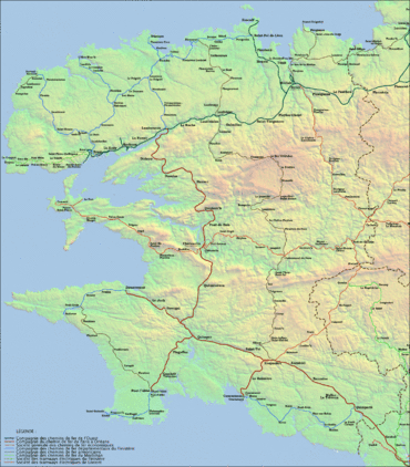 The CFDF was a voie ferrée d'intérêt local. The main line ran from Brest to St. Pol-de-Léon with branches to Porspoder, L'Aber-Wrach, Brignognan and Quimperlé. The CFDF absorbed the Chemins de Fer Armoricains (CFA) in 1921[1] and the Tramways Électrique du Finistère in 1922.[2] The railway was operated by the Compagnie des chemins de fer départementaux du Finistère until 1936, then by the Régie départementale des chemins de fer et autobus du Finistère until 28 February 1939 and finally by the Société générale de chemins de fer économique from 1941 to 1946. Service was suspended between 1939 and 1941.[3]