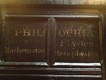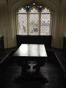 In 1653 the college buildings were bought with the bequest of Humphrey Chetham, for use as a free library and blue coat charity school. At that time there was no facility for independent study in the north of England and Chetham's will of 1651 had stipulated that the Library should be "for the use of schollars and others well affected", and instructed the librarian "to require nothing of any man that cometh into the library".[11] The twenty four feoffees appointed by Humphrey Chetham set out to acquire a major collection of books and manuscripts that would cover the whole range of available knowledge and would rival the college libraries of Oxford and Cambridge.[11] In order to protect the newly acquired books from rising damp the Library was housed on the first floor and, in accordance with the provisions of Chetham's will, the books were chained to the presses (bookcases).[11] Twenty-four carved oak stools with 'S'-shaped hand-holds (which are still in use) were provided as seats for readers.[11]