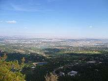 Cheyenne Mountain has three peaks. The southern peak is Cheyenne Mountain's summit at 9,200 feet (2,800 m) in elevation, the antenna farm sits on the middle peak, and the northern peak is called The Horns.[5][lower-alpha 2] Cheyenne Mountain Highway ends at The Horns.[7]:18,19