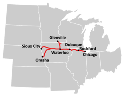 The Chicago Central and Pacific Railroad (reporting mark CC) is part of the Illinois Central Railroad (IC) owned by Canadian National Railway (CN) through the Grand Trunk Corporation. Operationally, the Chicago Central and Pacific is designated as the Iowa Zone of CN's Southern Region.[1][2]
