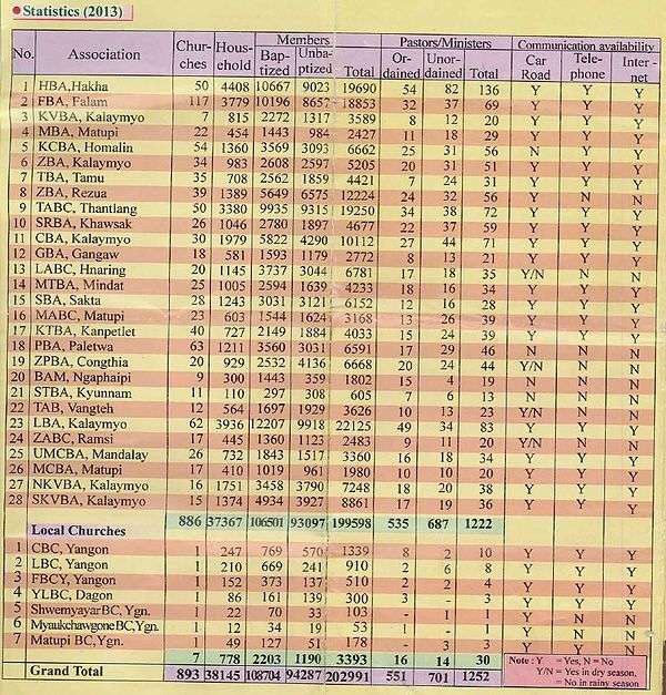 In 2013, the Chin Baptist Convention reported 202,991 members in 38145 household in 893 Churches.[8]