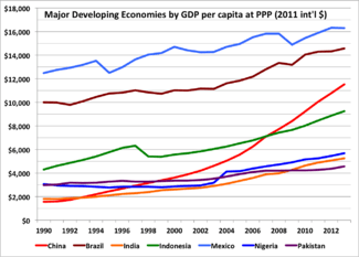 Since the introduction of economic reforms in 1978, China has become one of the world's fastest-growing major economies. As of 2014, it is the world's second-largest economy by nominal GDP and largest by purchasing power parity (PPP). China is also the world's largest exporter and second-largest importer of goods.[20] China is a recognized nuclear weapons state and has the world's largest standing army and second-largest defense budget.[21][22] The PRC is a member of the United Nations, as it replaced the ROC as a permanent member of the U.N. Security Council in 1971. China is also a member of numerous formal and informal multilateral organizations, including the WTO, APEC, BRICS, the Shanghai Cooperation Organization (SCO), the BCIM and the G-20.