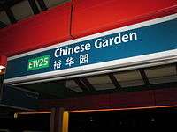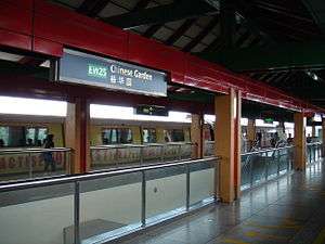 Chinese Garden MRT Station (EW25) is an above-ground Mass Rapid Transit station on the East West Line in Jurong East, Singapore. It serves residents in Yuhua and Hong Kah, as well people visiting the various tourist attractions in Jurong Lake, which includes the Chinese Gardens, where the station derived its name from. Its station colour is yellow.